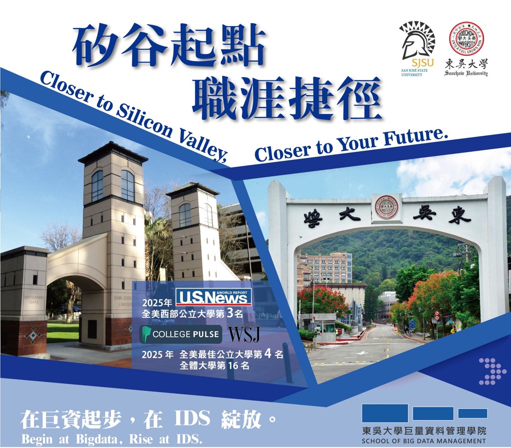 為深化國際學術合作、培育具備全球競爭力之跨域專業人才,東吳大學巨量資料管理學院與美國「聖荷西州立大學(San José State University)」資訊、數據與社會學院(College of Information, Data and Society,IDS)建立合作關係,共同推動「3(4)+1+1碩士銜接課程」。此合作模式提供巨資學院學生於學士階段完成指定學分後,銜接赴美修讀碩士課程之管道,縮短修業年限,提升國際學習效益,為學生打造更具彈性與前瞻性的升學選擇。