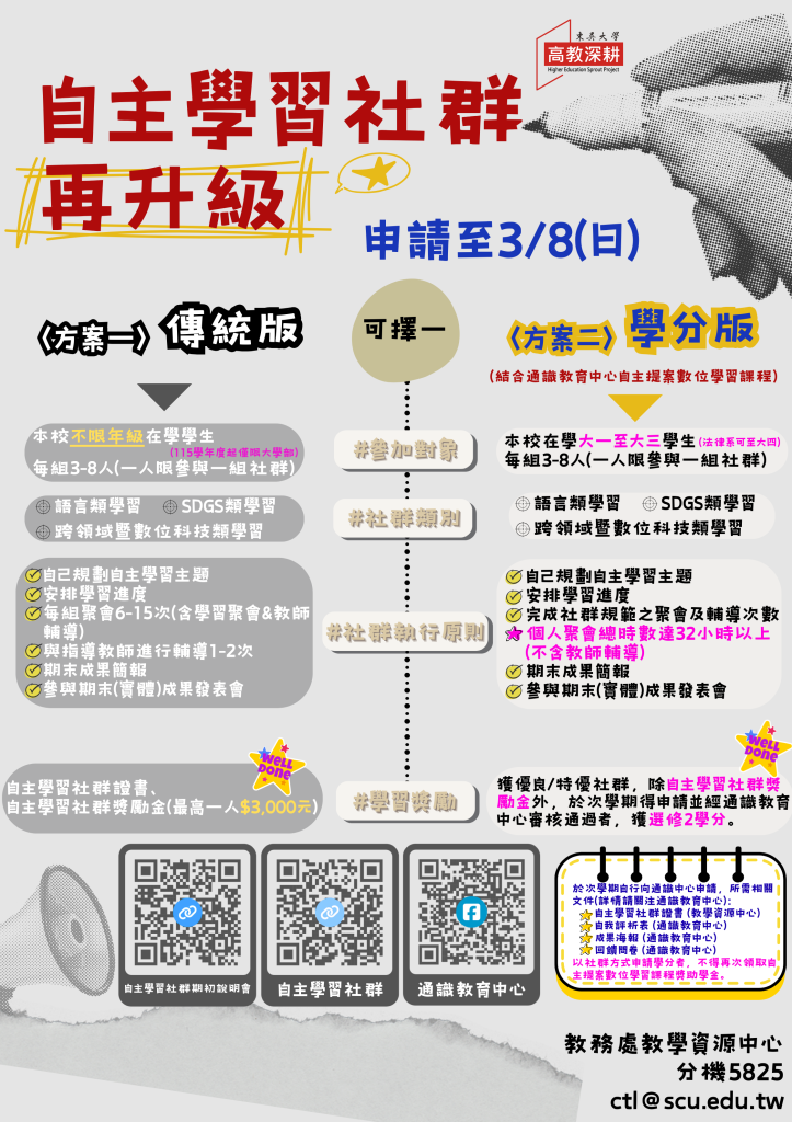 Post published:2026 年 2 月 24 日 自主學習社群2.1再次升級【期初線上說明會】 點我報名參加日期/時間:2/26(四)下午12:10-13:00地點:MS TEAMS(連結將另行mail通知)註:本學期開始新增方案二(學分制)─結合通識教育中心自主提案數位學習課程 註:凡參與期初線上說明會的同學,初審時將優先考量入選。自主學習社群申請時間:即日起至3/8(日)截止社群詳細辦法:https://web-ch.scu.edu.tw/ctl/web_page/15565 返回最新消息列表 推薦更多 【健康暨諮商中心】「咖啡渣手作感官體驗加流香」實作講座 2025 年 9 月 30 日 東吳「大學品牌力」財經、法政雙料私校第一 「企業最愛大學生」金融業私校奪冠 2024 年 3 月 21 日 【教師教學發展組】114年5、6月教學實踐計畫構思的創新與主題規劃/教學實踐學習成效評量與分析 線上研習報名 2025 年 4 月 14 日