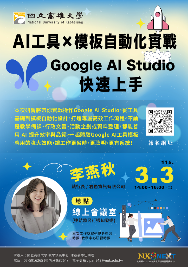 Post published:2026 年 2 月 26 日 一、旨揭活動將實戰操作Google AI Studio,從AI工具基礎到模板自動化設計,不論是教學備課、行政文書、活動企劃或資料整理,打造個人專屬高效工作流程。 二、活動資訊:(一)時間:115年3月3日(二)14:00-16:00(二)講師:李燕秋 執行長/君邑資訊有限公司(三)地點:Microsoft Teams(四)報名網址:https://reurl.cc/9bjW3d(五)報名期限:115年3月1日18:00止 三、活動認列終身學習時數及本中心研習時數。 四、檢附活動海報,敬請參考。 五、聯絡人:國立高雄大學教學發展中心潘小姐,電話(07)591-6265(分機8264),Email:pan543@nuk.edu.tw 返回最新消息列表 推薦更多 【高教深耕】AI助力EMI教學創新應用 2025 年 3 月 25 日 Dcard剪接師Leo親授自媒體經營心法 啟發學生創意思維 2024 年 2 月 15 日 【商學院】鼓勵學生參與英文類競賽獎補助實施要點 2024 年 10 月 11 日