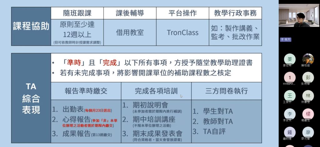 同步說明優良與特優TA遴選制度,結合成果報告審查、學生問卷評核及教師推薦、發表與選拔等多元評量機制,提供公開表揚管道與獎勵措施。未來為協助教學助理發揮關鍵力、形成影響力,將持續優化TA培訓內容與支持措施,共同提升課程品質與校園學習環境。