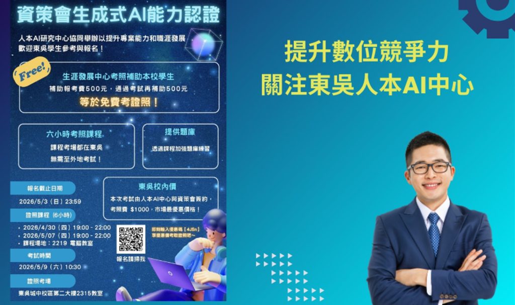 人本AI研究中心指出,本學期將持續開設「生成式AI基礎素養能力認證課程」,並預計於115年5月9日在城中校區辦理校內認證考試與相關工作坊,持續推動師生AI專業能力培養,以提升東吳學生的數位競爭力。