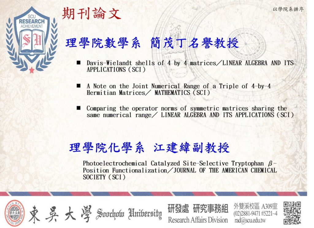 研究事務組提醒:教師如有最新發表於AHCI、SSCI、SCI、TSSCI、THCI、「東吳大學外語學門獎勵名單」之期刊論文,歡迎隨時至GOOGLE表單填寫(網址為https://forms.gle/e6U4dL7pRNfgXnsHA)相關資訊,研究發展處將會公告於校園頭條及研究發展處首頁,以廣交流。