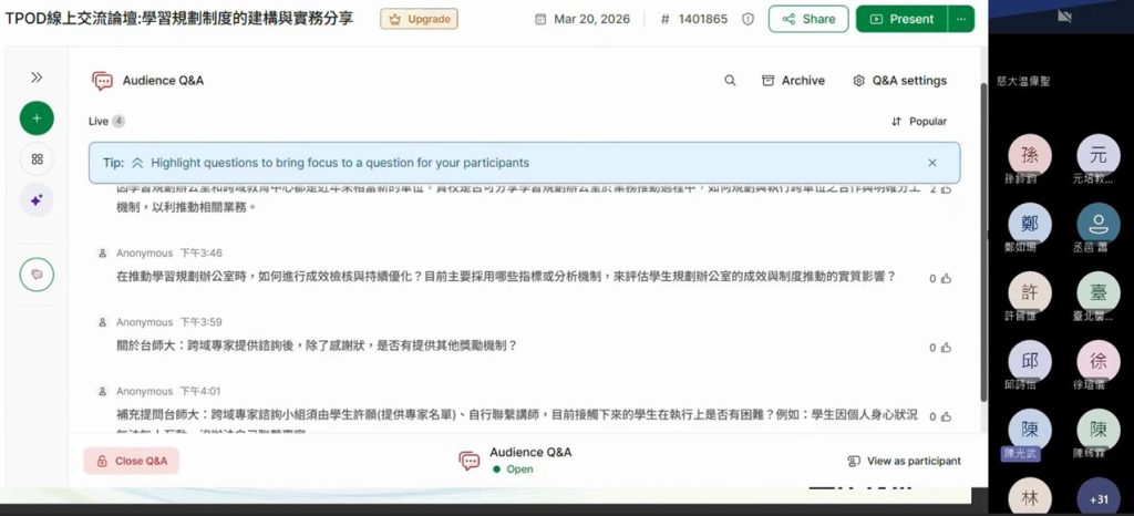 本校教務處教學資源中心特別與TPOD臺灣高等教育教學專業發展學會攜手,於115年3月20日舉辦「學習規劃制度的建構與實務分享」線上交流論壇,邀請國立臺灣師範大學、臺北醫學大學及長庚大學共同分享相關作法與實務經驗,吸引全台25所大學、共68位教職員生線上與會,聚焦「以學生為中心」的學習規劃與跨團隊協作模式。