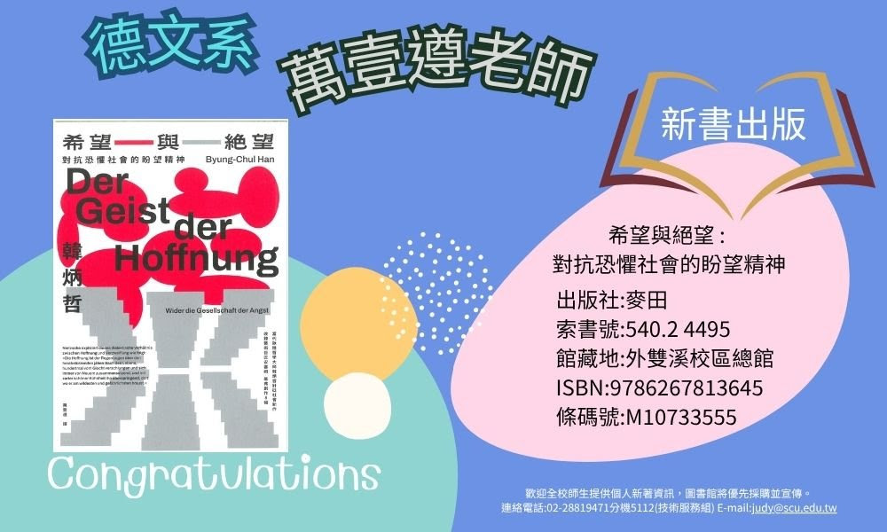 Post published:2026 年 4 月 17 日 恭喜 德文系萬壹遵老師新書出版書名:希望與絕望 :對抗恐懼社會的盼望精神出版社:麥田索書號:540.2 4495館藏地:外雙溪校區總館ISBN:9786267813645條碼號:M10733555歡迎全校師生提供個人新著資訊,圖書館將優先採購並宣傳。連絡電話:02-28819471分機5112(技術服務組) E-mail:judy@scu.edu.tw 返回最新消息列表 You Might Also Like 本校通過「網站無障礙標章AA等級」認證 2024 年 7 月 10 日 【東吳實踐家創創基地】「從電競到電商-品牌創業分享」講座 2023 年 11 月 3 日 南非代表訪問東吳大學 推動學術合作 2025 年 3 月 27 日