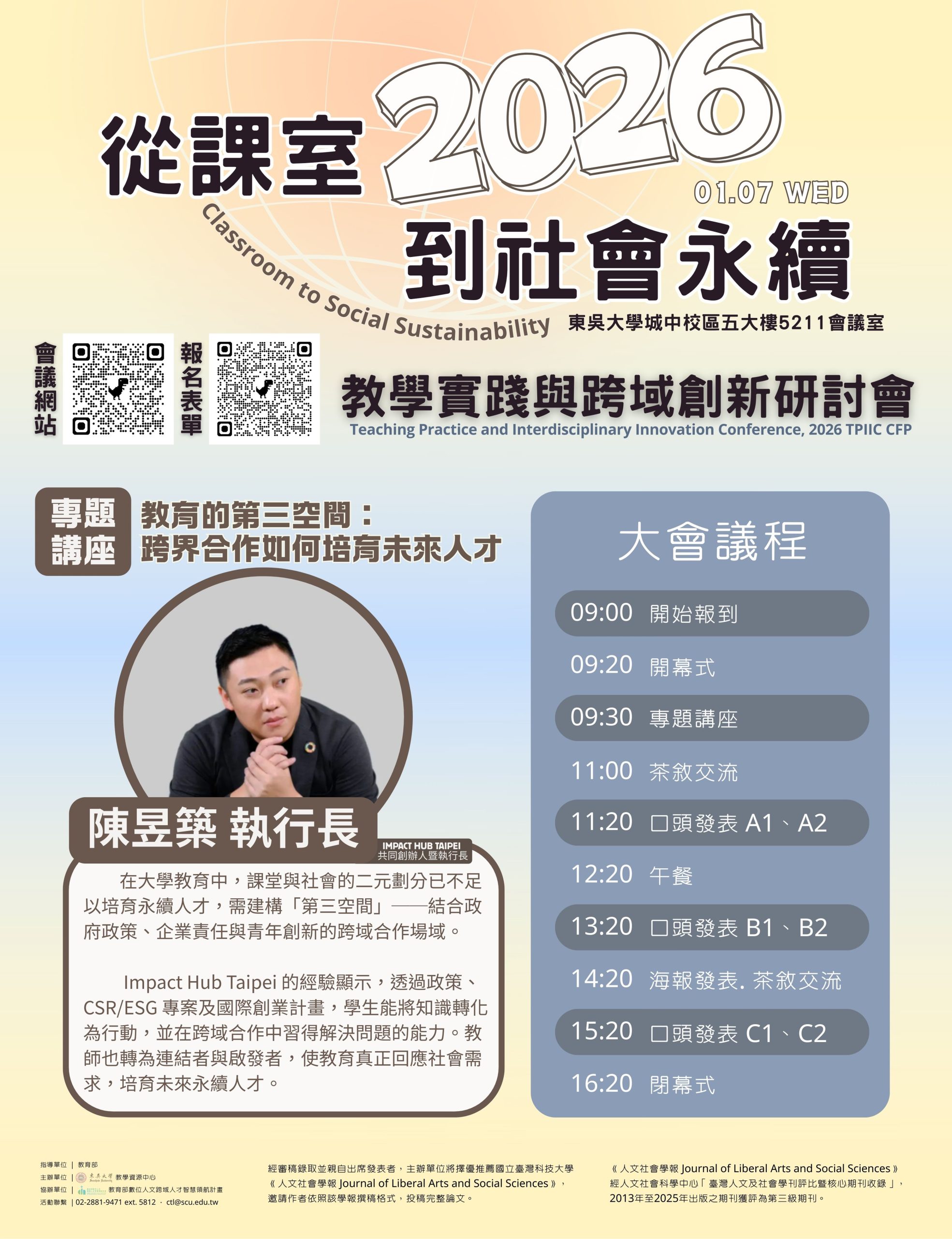 最新消息 ● ○ 東吳政治學系3研究中心揭牌 全台首座大學「政策創新實驗室」亮相 2025 年 12 月 23 日 東吳資料科學系、會計學系師生榮獲國科會113年度大專學生研究計畫研究創作獎 2025 年 12 月 23 日 東吳大學與耀汶科技簽署MOU 共育跨境電商與AI行銷實戰人才 2025 年 12 月 19 日 東吳新生入學獎學金 最高240萬 2025 年 12 月 19 日 【教學資源中心】本校教學資源中心辦理「2026從課室到社會永續:教學實踐與跨域創新研討會」,歡迎踴躍報名! 2025 年 12 月 16 日 東吳大學攜手臺灣文創發展股份有限公司 啟動跨域產學合作新篇章 2025 年 12 月 16 日 【圖書館公告】英文系教師著作 2025 年 12 月 10 日 【圖書館公告】 日文系教師新著 2025 年 12 月 10 日 【圖書館公告】英文系教師著作 2025 年 12 月 10 日 上一頁 Page1 Page2 Page3 Page4 Page5 下一頁