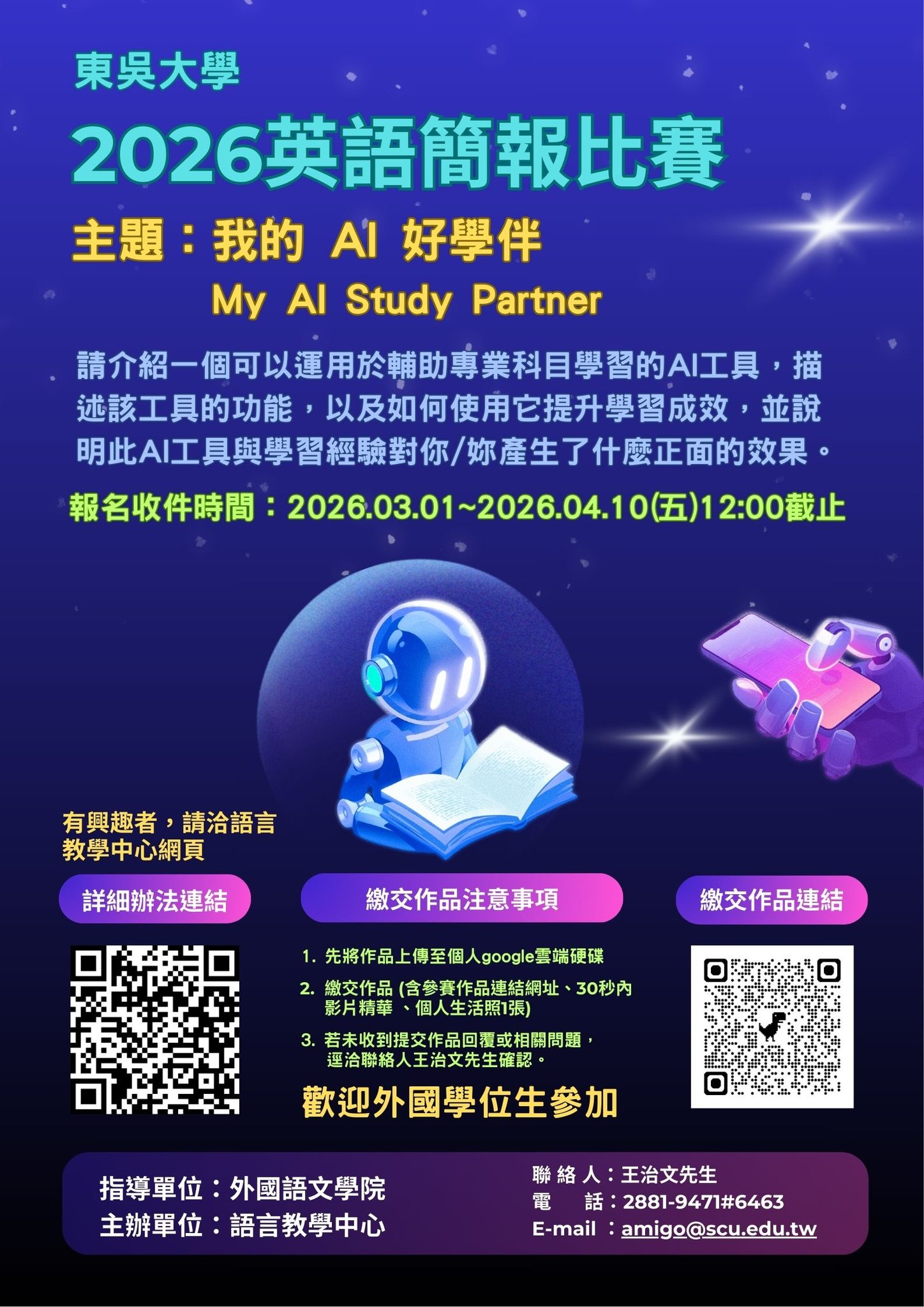 最新消息 ● ○ 【語言教學中心】「2026英語簡報比賽」又來囉! 2026 年 2 月 24 日 【圖書館公告】英文系教師新著 2026 年 2 月 24 日 東吳巨資學院高中生營隊 培育AI與機器人新世代人才 2026 年 2 月 9 日 劉源俊名譽教授新著 2026 年 2 月 9 日 東吳通識教育中心攜手配音工會簽署MOU 開啟聲音教育新頁 2026 年 1 月 28 日 「2026從課室到社會永續:教學實踐與跨域創新研討會」 展現創新與永續教學多元成果 2026 年 1 月 28 日 【圖書館】劉源俊名譽教授新著 2026 年 1 月 27 日 114學年度教師特色教學示範影片-教學跨領域-蘇明祥老師、林盈翔老師 2026 年 1 月 26 日 理學院導師輔導知能研習「辨識創傷與療癒之旅」 2026 年 1 月 26 日 上一頁 Page1 Page2 Page3 Page4 Page5 下一頁