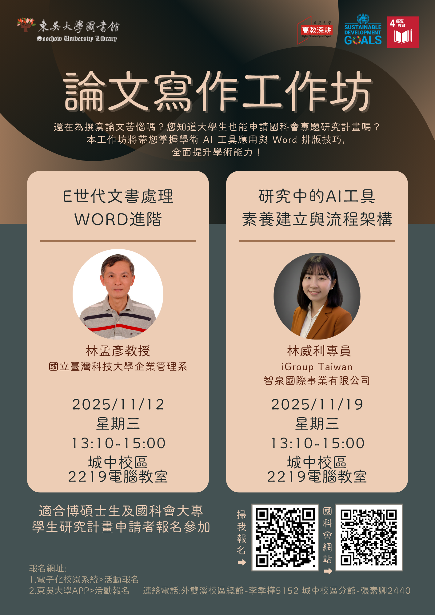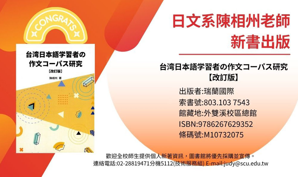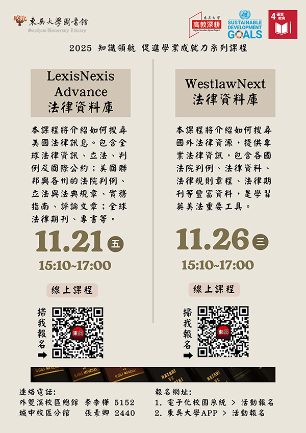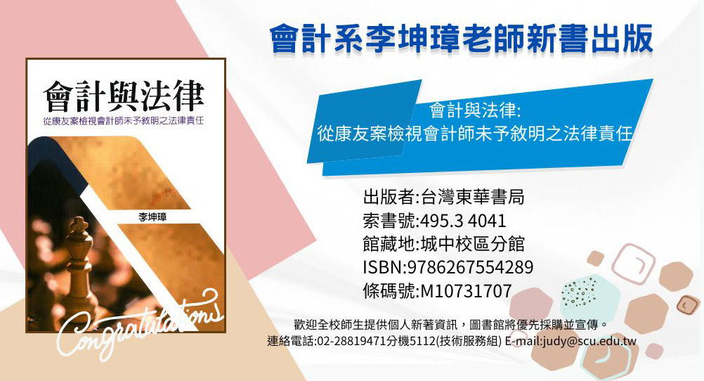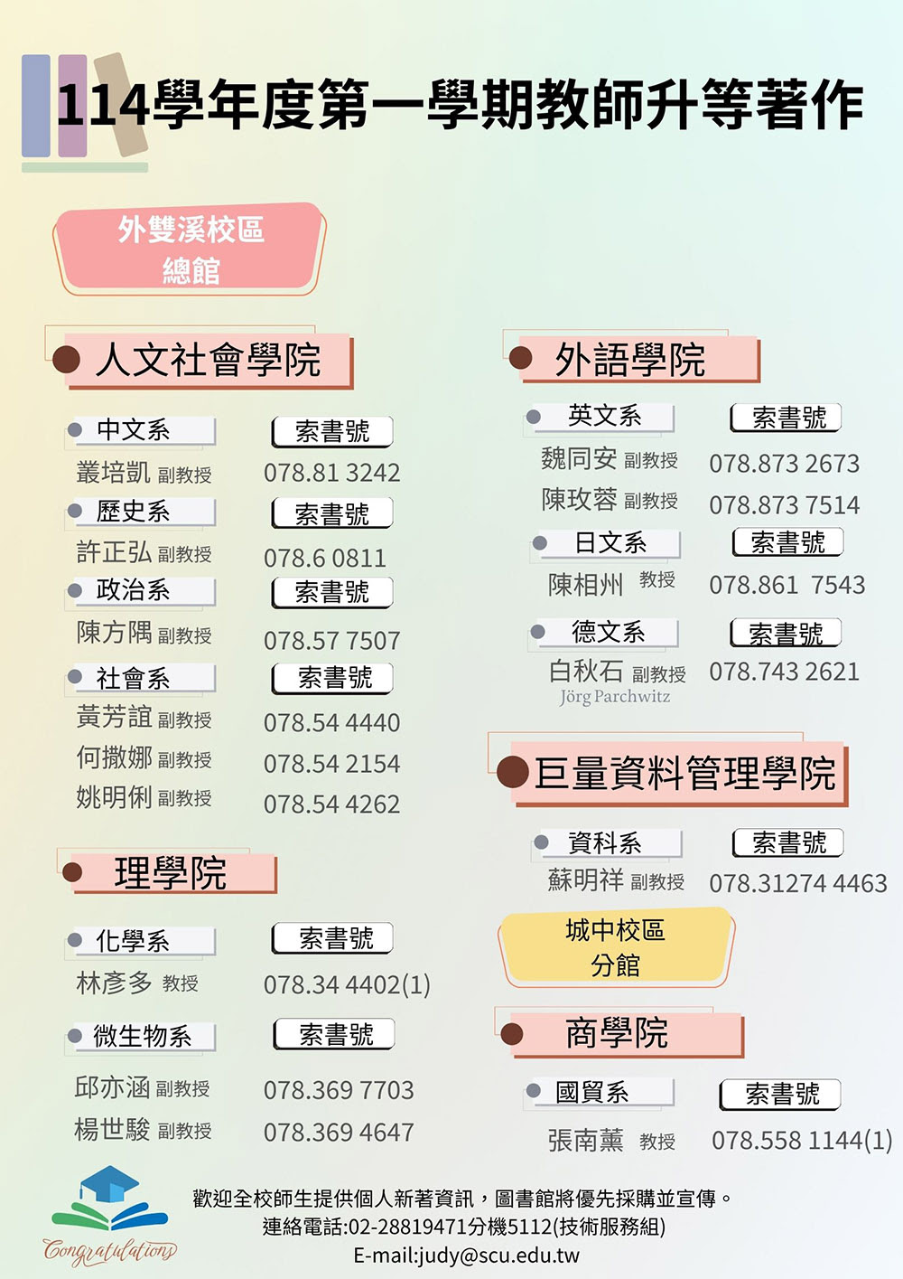 最新消息 ● ○ 【圖書館公告】會計系教師著作 2025 年 11 月 7 日 【圖書館利用教育】洞悉法律脈絡,掌握法學思維 2025 年 11 月 7 日 【圖書館公告】論文寫作工作坊下週登場!報名倒數中! 2025 年 11 月 7 日 【圖書館公告】 日文系教師著作 2025 年 11 月 7 日 【圖書館公告】114學年度第一學期教師升等著作 2025 年 11 月 7 日 募的就是你:114-2募課微課程(無學分)開募啦! 2025 年 10 月 30 日 開拓國際視野絕佳機會 即日起受理赴海外交換研修申請 2025 年 10 月 30 日 【未來人才】當大學不只傳道授業,東吳如何用「士林學」接軌在地、用人文思維走向國際?ft. 東吳大學副校長王世和遠見on air 2025 年 10 月 30 日 【人本AI研究中心】多場演講活動敬邀參加 2025 年 10 月 27 日 上一頁 Page1 Page2 Page3 Page4 Page5 下一頁